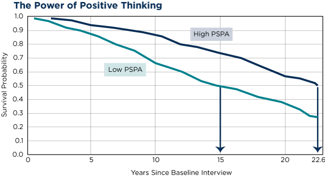 The boost in “survival probability” for those with positive self-perceptions of aging (PSPA) in middle age worked out to an average of 7½ more years of life.